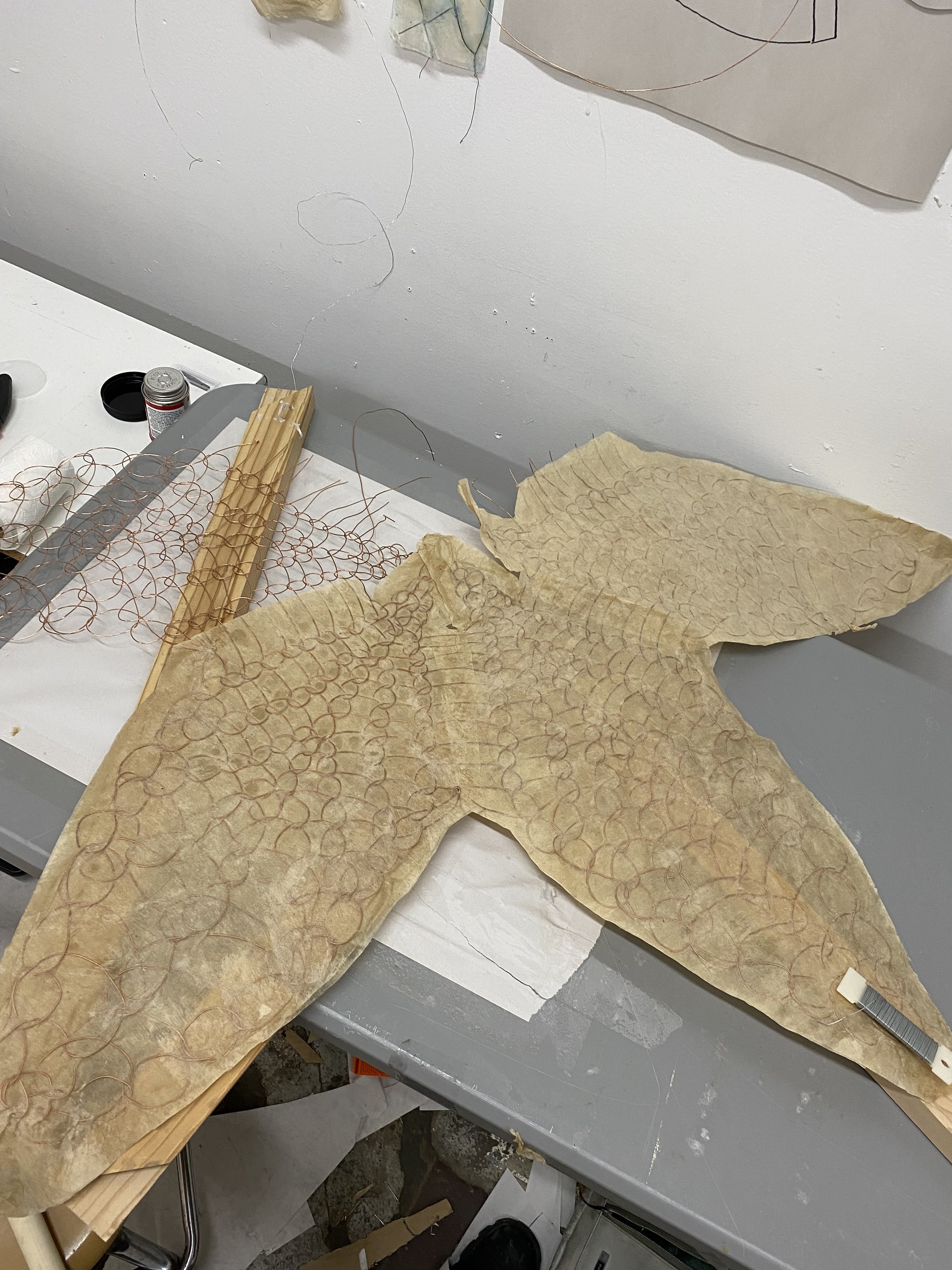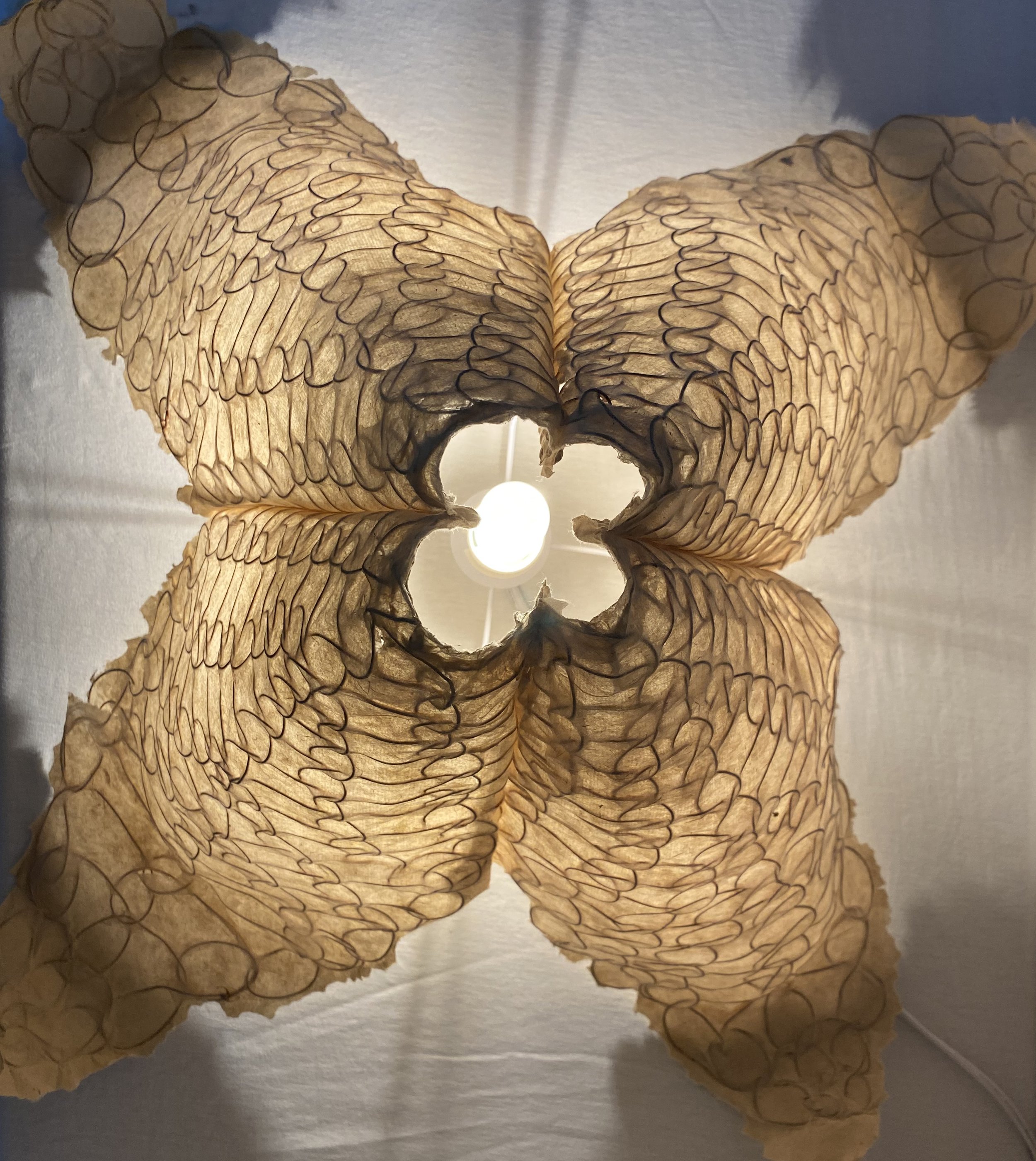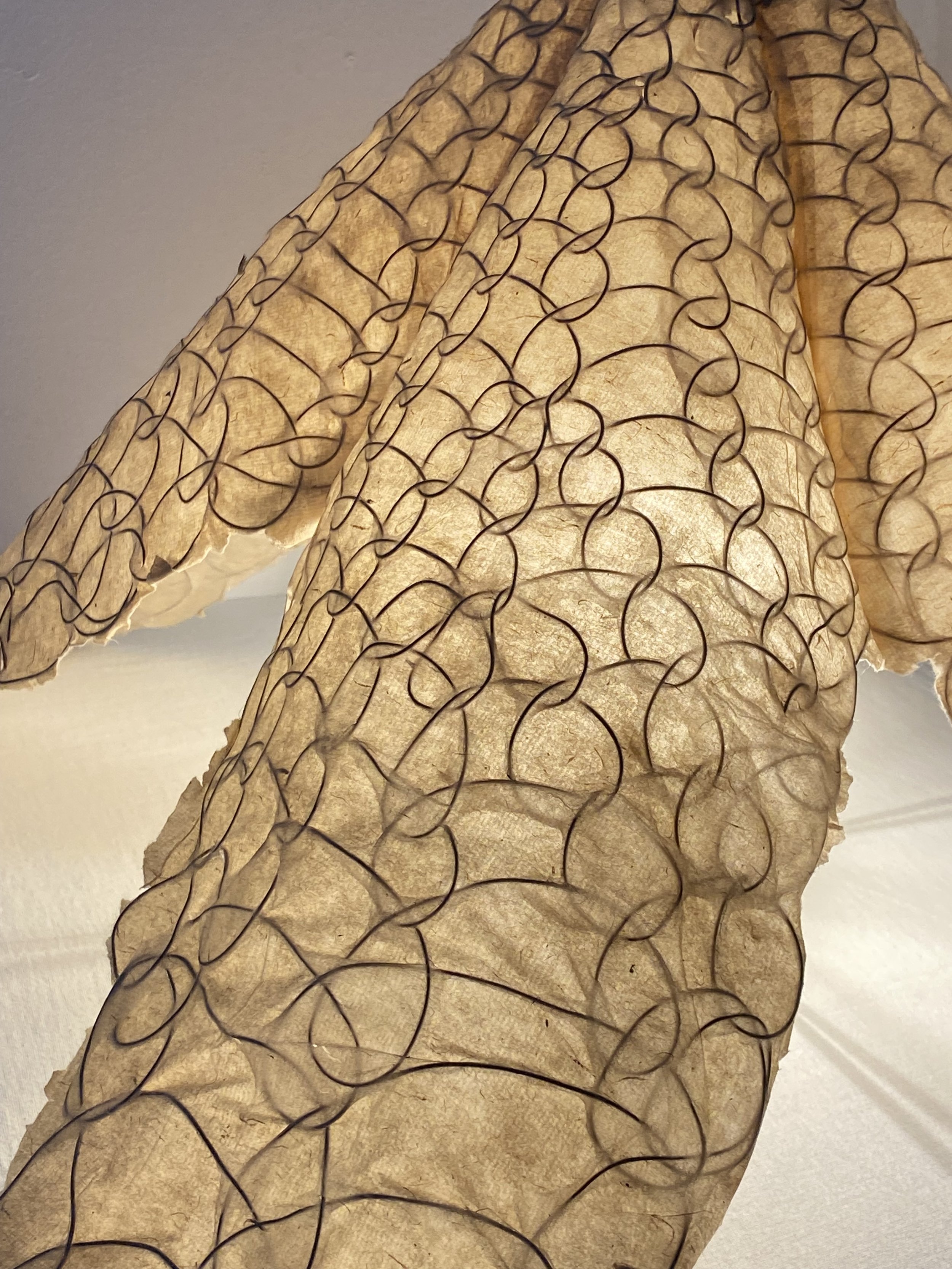 Loop Lamp, 2023- looped copper wire, rice paper, iron frame, bulb